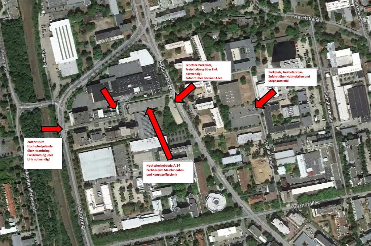 Direkt hinter der Bushaltestelle “Hochschule” in der Berliner Allee befindet sich ein unbefestiger Parkplatz mit Schranke, die Sie mit einem von uns bereitgestellten temporär und nur für diesen Parkplatz gültigen Link selbst öffnen können.