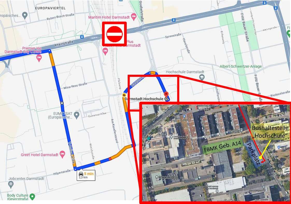 Biegen Sie rechts in die Deutsche Telekom-Allee, folgen der Straße für ca 800m und halten sich links. Von der Deutschen-Telekom-Allee biegen Sie links in die Hilpertstraße und halten sich auf der linken Spur. Biegen Sie nach ca. 400m dann links auf den Haardtring. Hier halten Sie sich rechts und folgem dem Haardtring an der Hochschule vorbei bis zur Berliner Allee. Hier biegen Sie wieder nach rechts auf genannte Berliner Allee. Nach ca. 200m - direkt nach der Bushaltestelle “Hochschule” - können Sie auf der rechten Seite auf den beschranken Parkplatz direkt an unseren Fachbereich fahren. Die Schranke können Sie mit einem von uns bereitgestellten temporär und nur für diesen Parkplatz gültigen Link selbst öffnen.